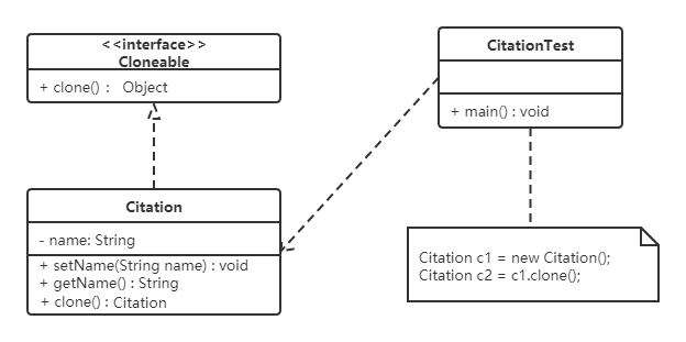 - 具体原型类:实现抽象原型类的 clone() 方法,它是可被复制的对象。